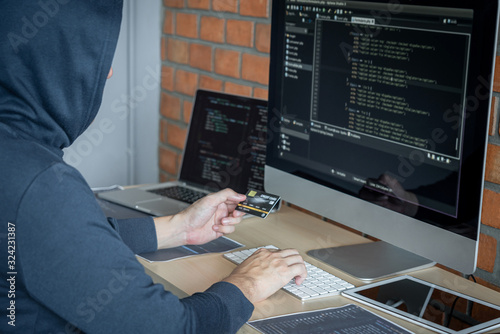Wall mural computer hacker or cyber attack concept, dangerous hooded hacker using multiple computers typing bad