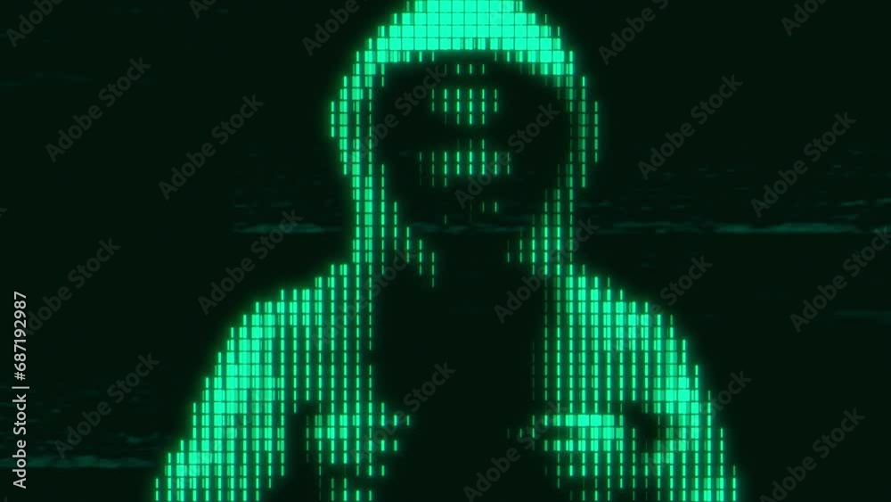 Computer hacker with hoodie and glitch face - computer abstract digital code at the background - darknWall mural