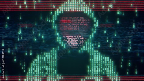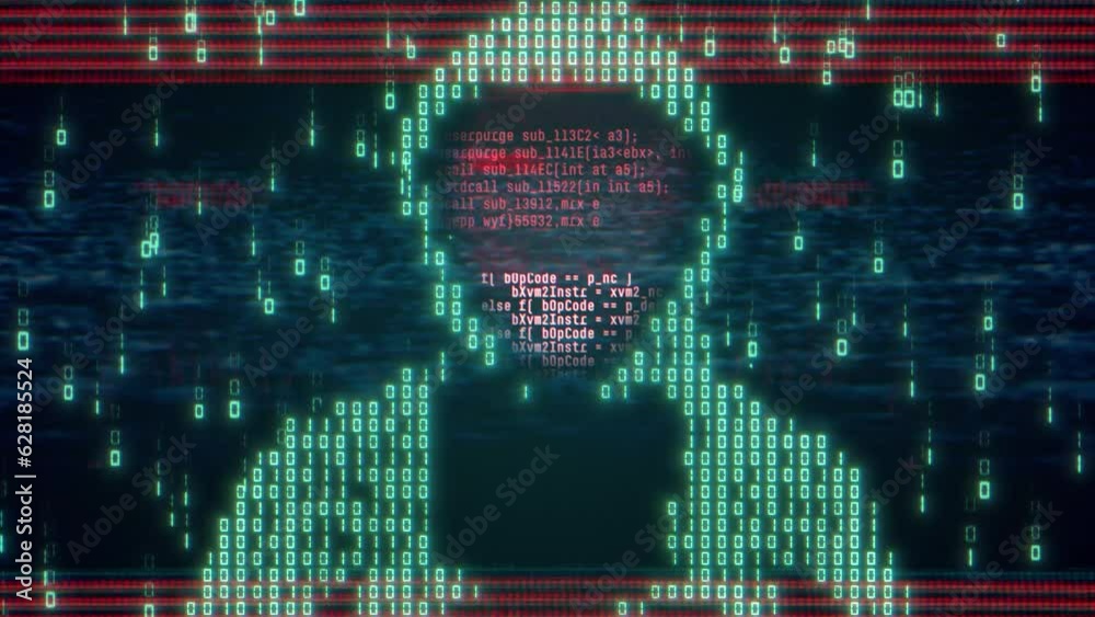 Computer hacker with hoodie and glitch face - computer abstract digital code at the background - darknWall mural