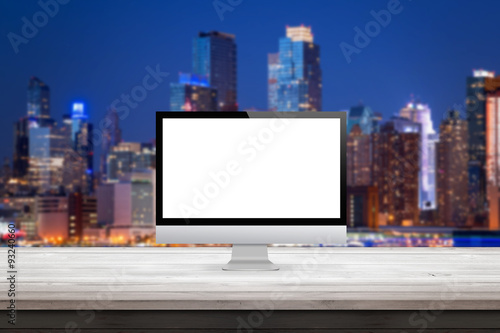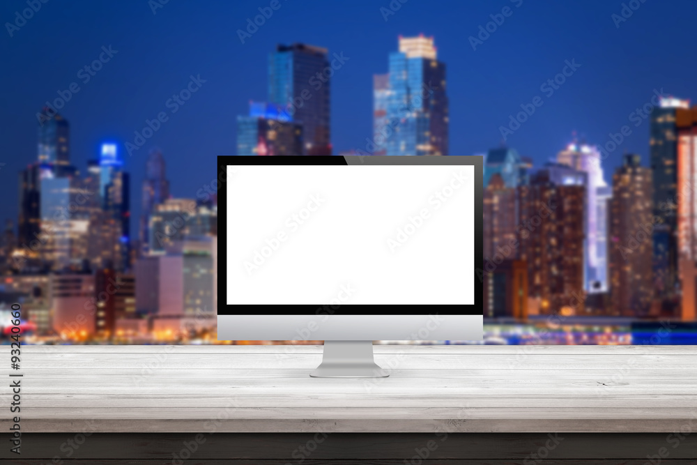 Wall mural : Computer monitor on wooden desk city sky line lights in the background display mock up