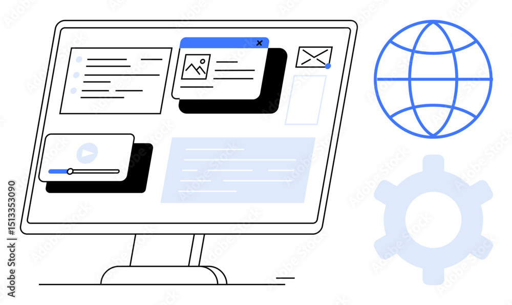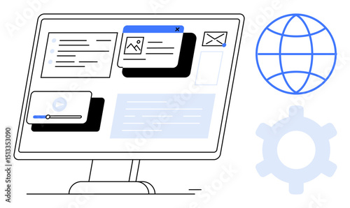Wall mural : Computer monitor with browser tabs, video player, and email pop-up - internet globe and gear convey c
