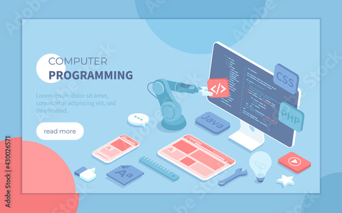Computer programming, software, web, app development - program code on monitor screen, website templaWall mural