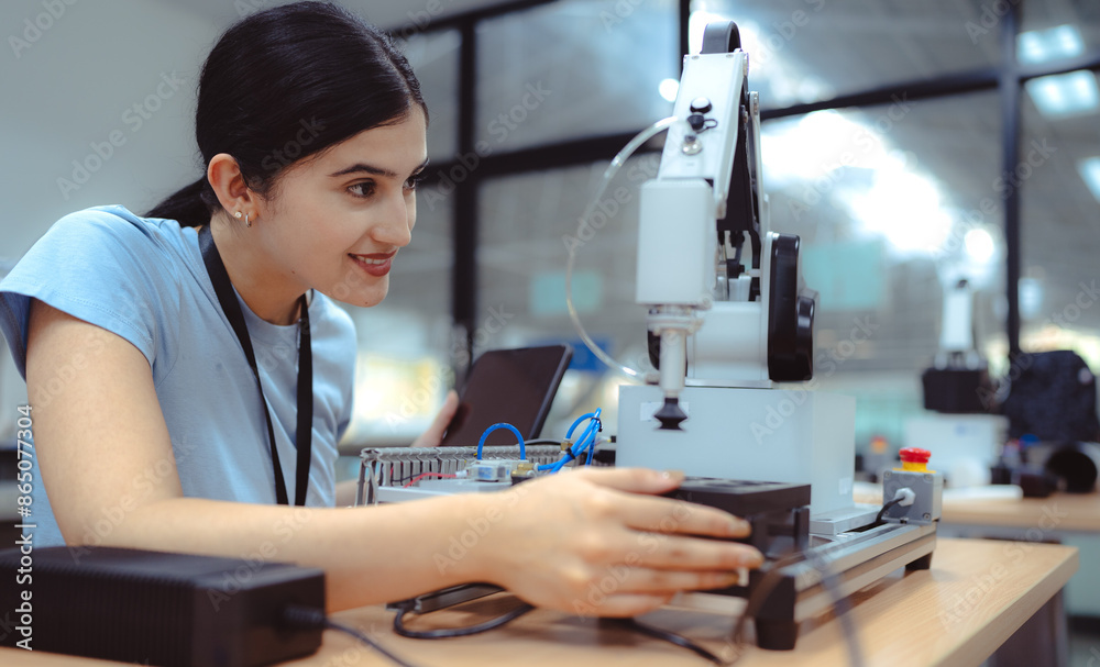 The watermark will not be included on Wall mural.: Computer science development engineer working on robotic arm connection control at electronic futuri