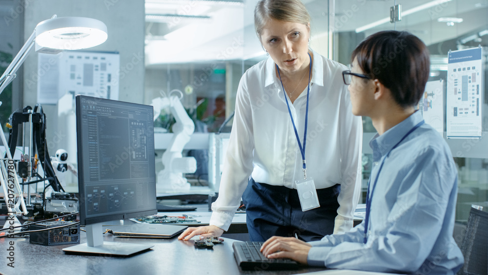 Wall mural : Computer science engineer wearing virtual reality headset works with 3d modeling, makes gestures - in