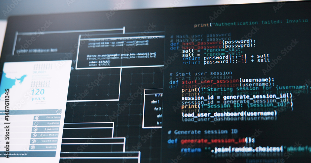 Wall mural computer screen, code and software development with programming language for ai or web design at off