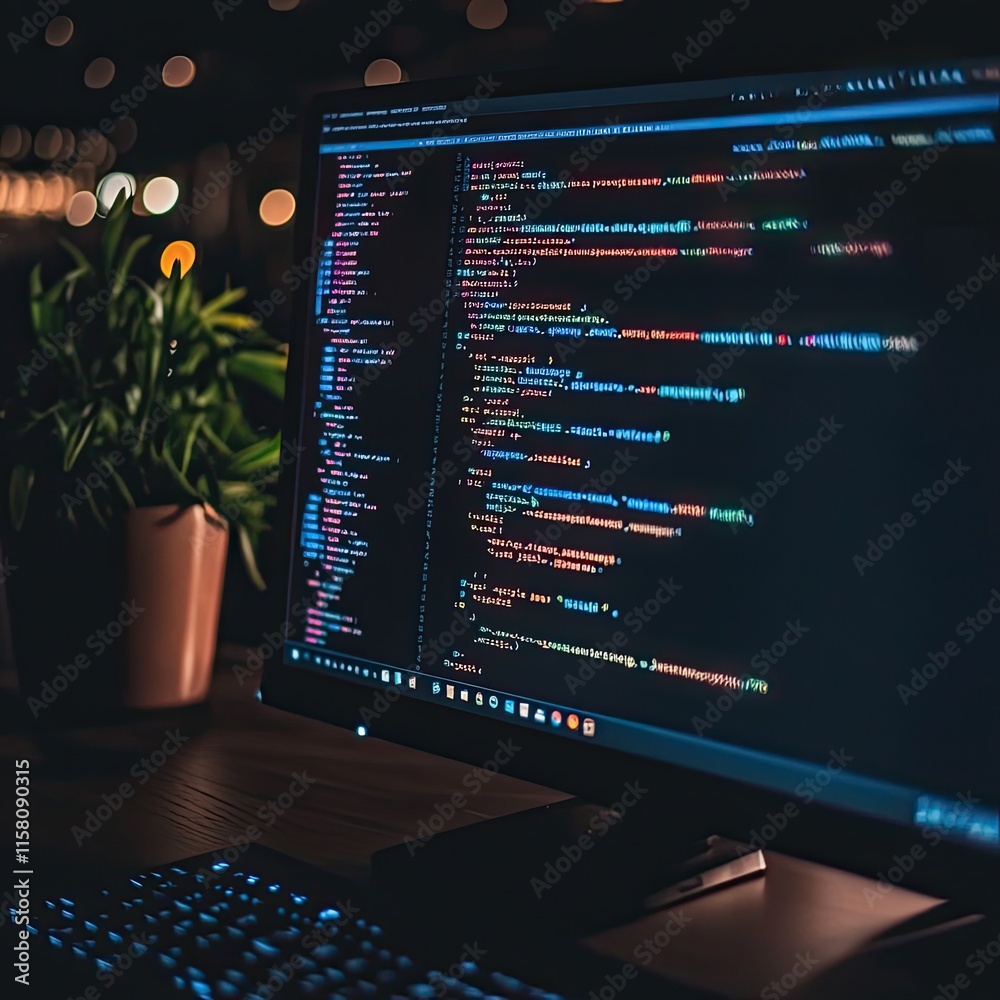 The watermark will not be included on Wall mural.: Computer screen displaying programming code at night