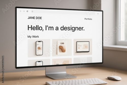 Wall mural computer screen mockup displaying minimalist designer portfolio website with product previews in cle - Wall murals Wall mural computer screen mockup displaying minimalist designer portfolio website with product previews in cle - Wall murals