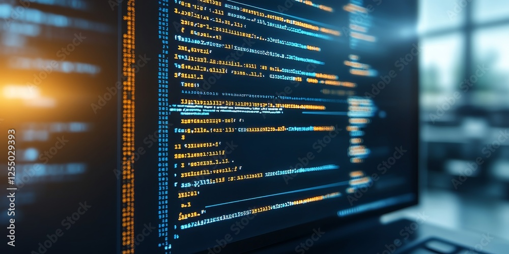 Wall mural : Computer screen with abstract programming code, cybersecurity, software development background