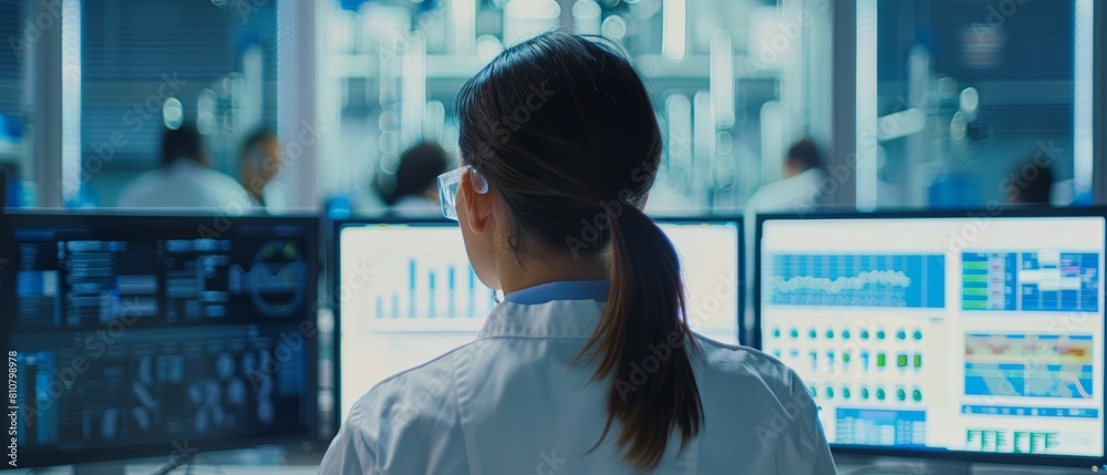 The watermark will not be included on Wall mural.: Computer screenshot: female it scientist is using a computer to monitor and control a system - in the