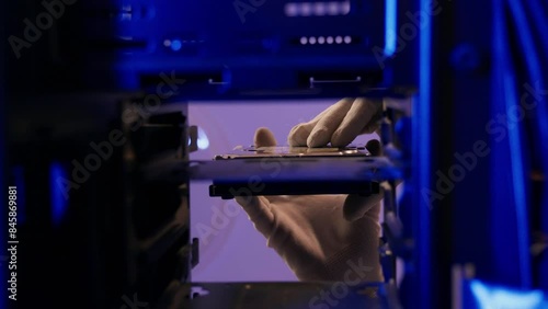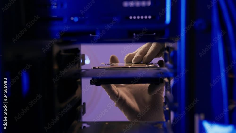 Wall mural computer technician installing hard disk close up in pc case. assemble computer system unit to a mod