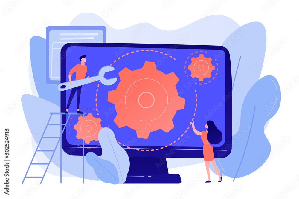 Wall mural computer technician with wrench repairing computer screen with gears. computer service, laptop repai - Wall murals Wall mural computer technician with wrench repairing computer screen with gears. computer service, laptop repai - Wall murals