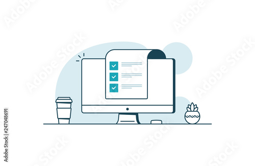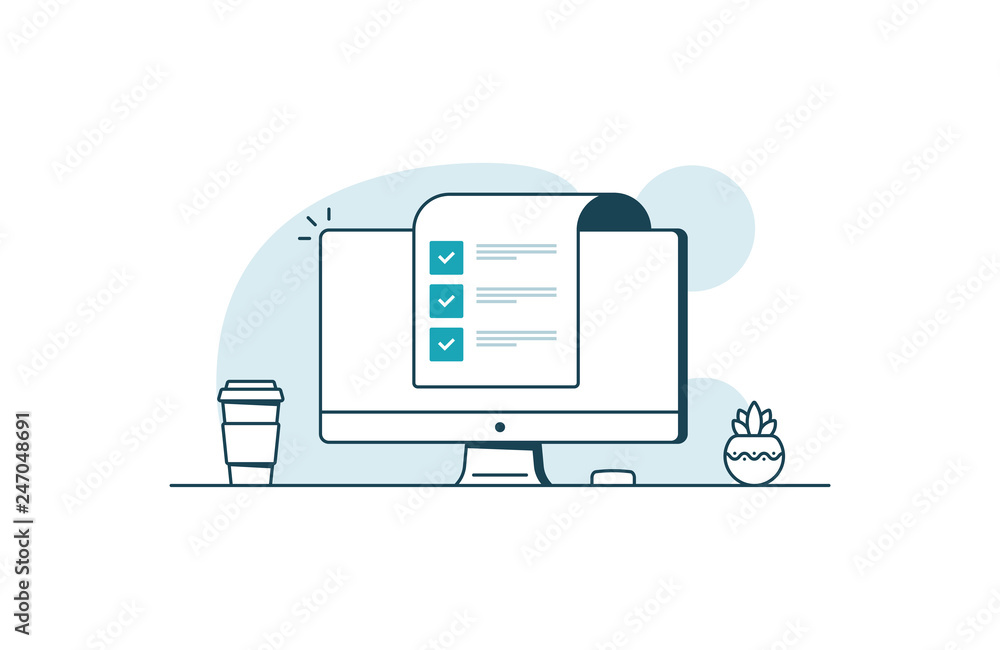 The watermark will not be included on Wall mural.: Computer with checklist - workspace with computer, coffee cup, plant and paper with checkboxes - vecto