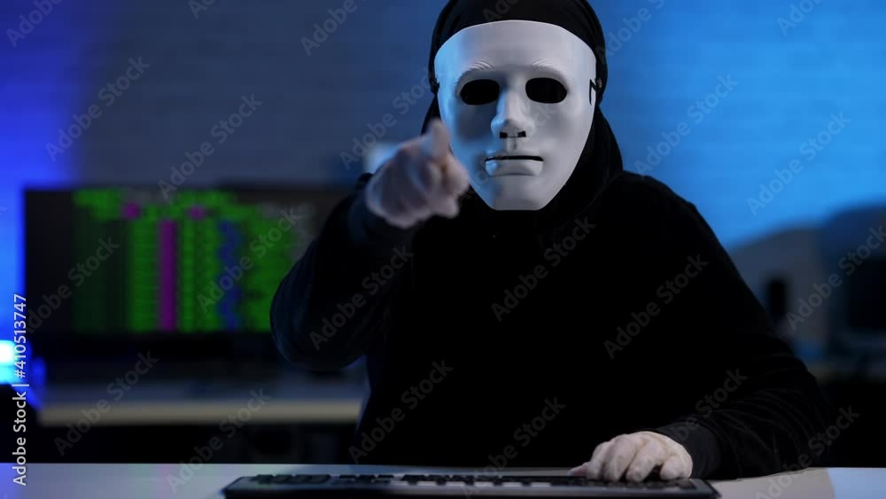 Concentrated hacker typing on keyboard, raising masked face and pointing at camera - unrecognizable pWall mural