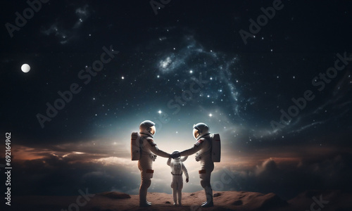 Wall mural : Concept of a family in space, parents and child in spacesuits on mars