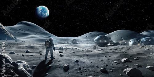 Wall mural concept of a futuristic lunar base with advanced structures, astronaut in space suit and the earth s - Wall murals Wall mural concept of a futuristic lunar base with advanced structures, astronaut in space suit and the earth s - Wall murals