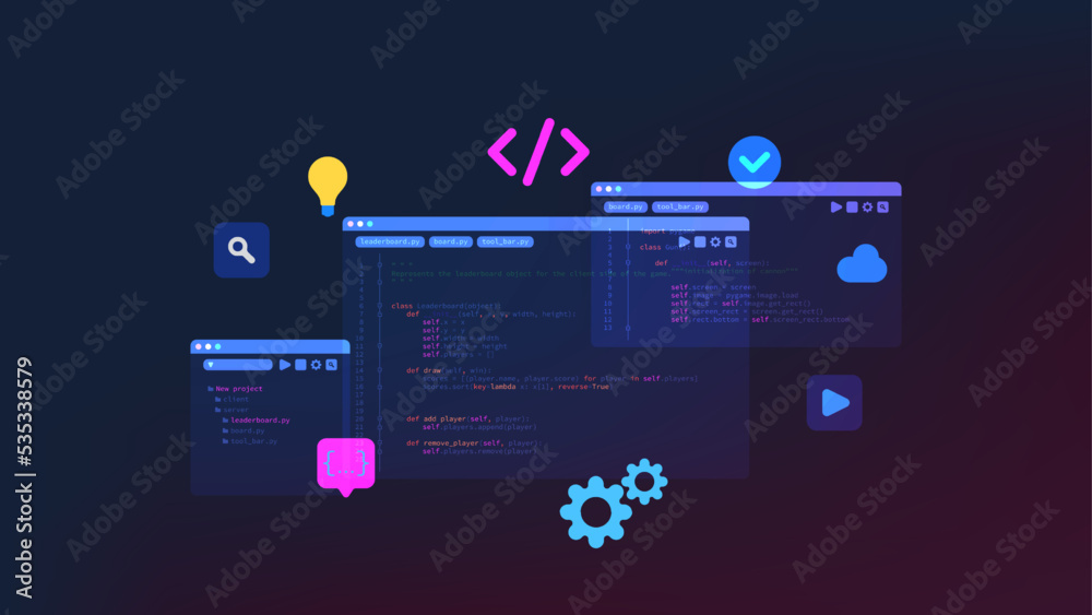 Wall mural concept of computer programming or developing software or game. vector 3d illustration with coding s