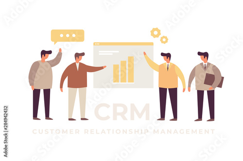 Wall mural concept of customer relationship management. businessmen discuss transactions, support systems and c