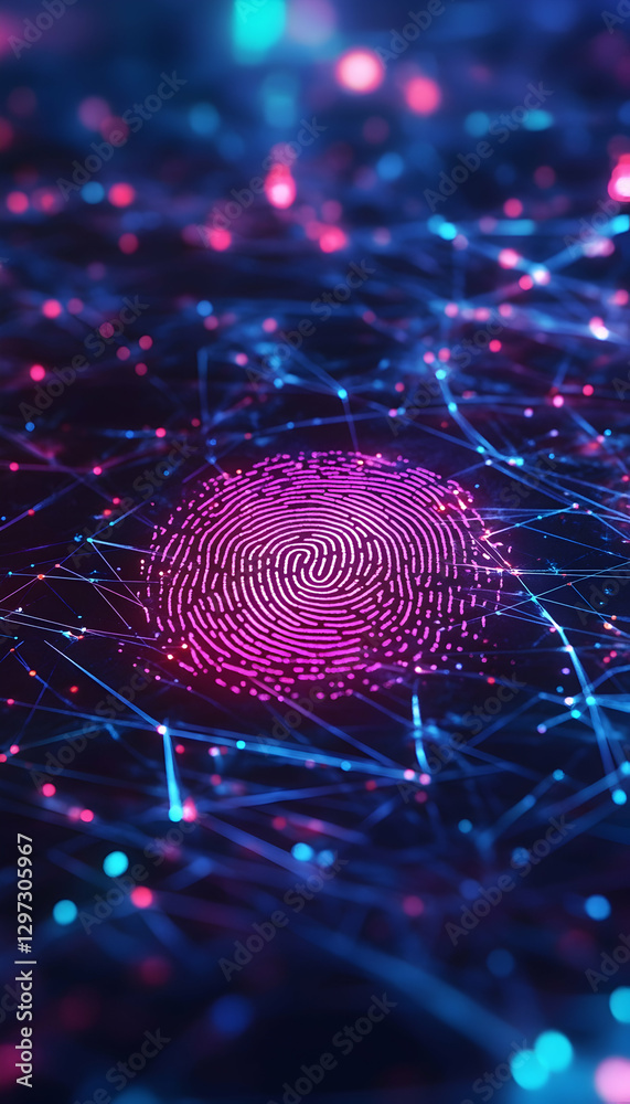 The watermark will not be included on Wall mural.: Concept of protecting personal data with a fingerprint on a neon cyber background -