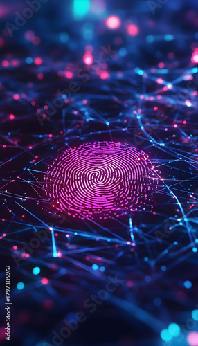 Wall mural concept of protecting personal data with a fingerprint on a neon cyber background -
