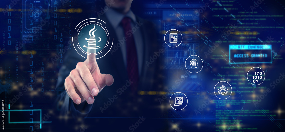 Wall mural concept of software development and digital technology. programmer for coding on a virtual display w - Wall murals Wall mural concept of software development and digital technology. programmer for coding on a virtual display w - Wall murals