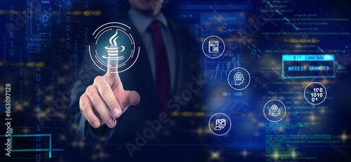 Wall mural : Concept of software development and digital technology - programmer for coding on a virtual display w