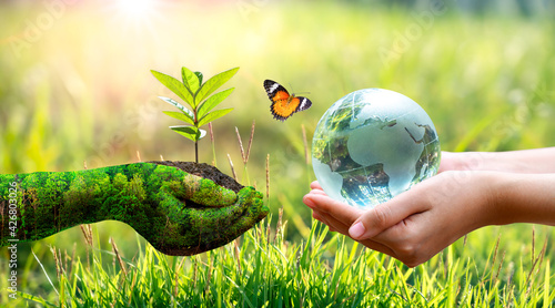 Wall mural concept save the world save environment the world is in the grass of the green bokeh background