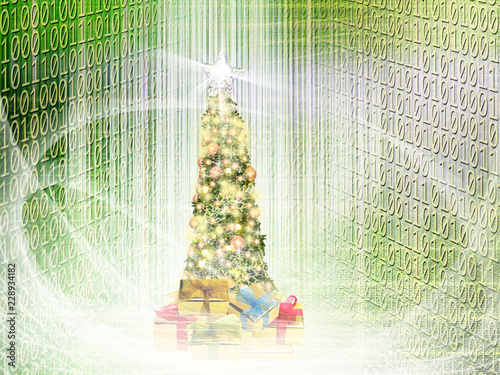Wall mural conceptual close up decorated shiny christmas tree in abstract structural lights and binary code of