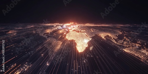 Wall mural : Conceptual digital world map with light trails symbolizing data transfer,space for text