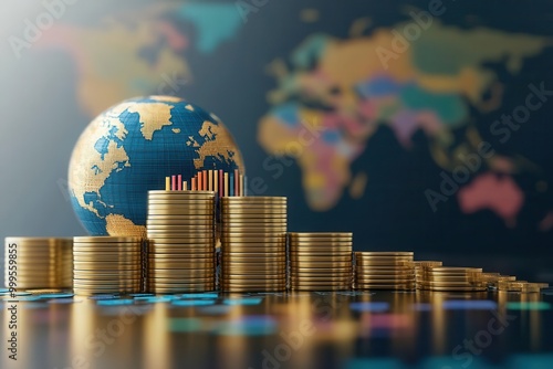 Wall mural : Conceptual image of global finance featuring a globe and stacks of coins, symbolizing wealth and inv