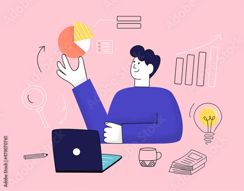 Wall mural : Confident young man sitting in office and analyzing data pointing graph and diagram - creative busine