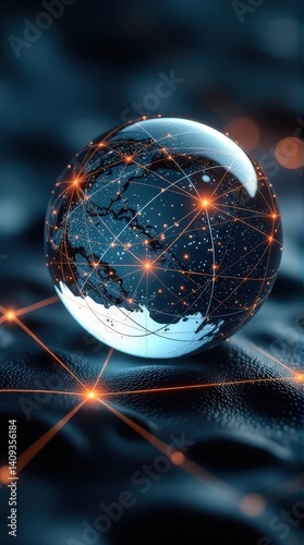 Wall mural : Connected world globe with glowing network lines on dark background -