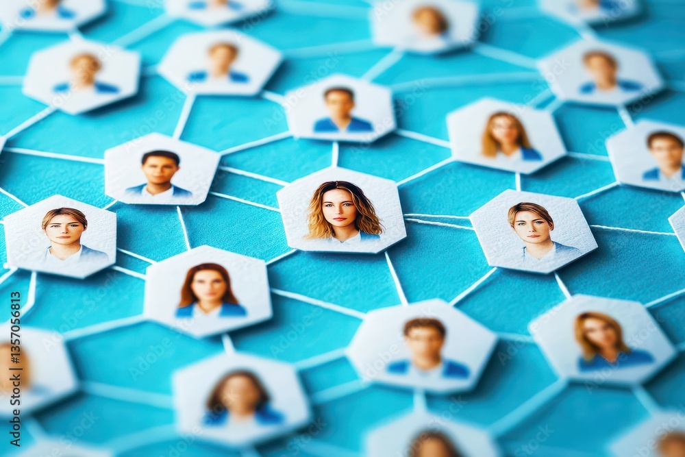 Wall mural connection network illustrating diverse faces in hexagonal arrangement on blue background for social - Wall murals Wall mural connection network illustrating diverse faces in hexagonal arrangement on blue background for social - Wall murals