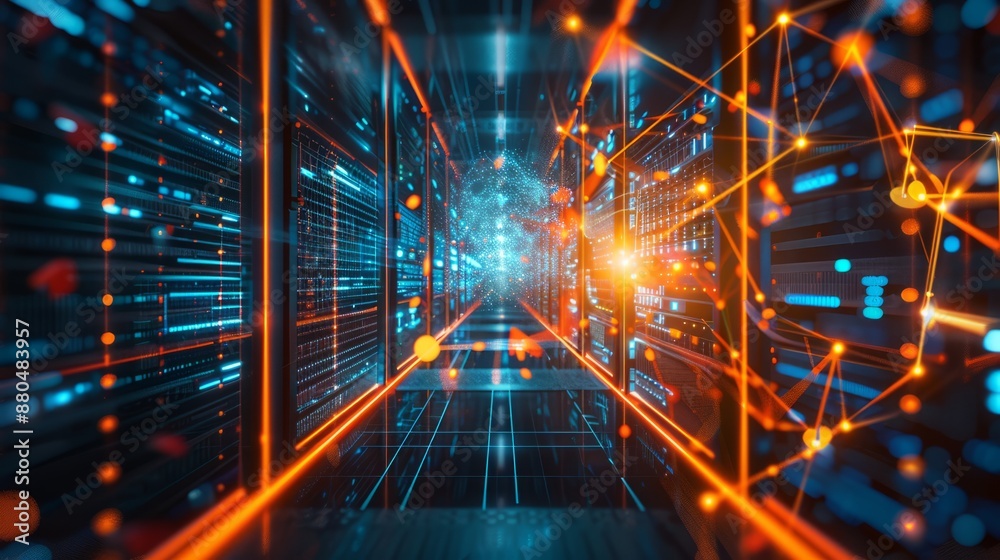 Wall mural connection network in servers data center room with storage systems – 3d rendering of advanced techn - Wall murals Wall mural connection network in servers data center room with storage systems – 3d rendering of advanced techn - Wall murals