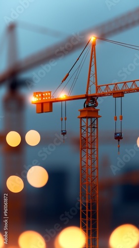 Wall mural construction crane with digital network light lines and bokeh background at dusk.