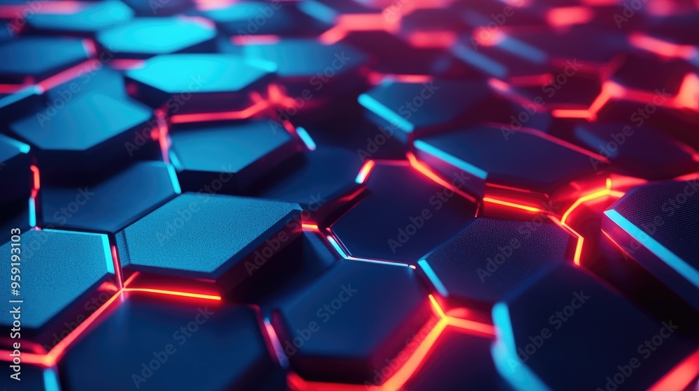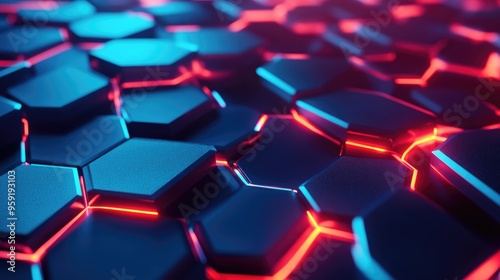 The watermark will not be included on Wall mural.: Contemporary abstract backdrop featuring luminous geometric lines with a blue gradient in a hexagona
