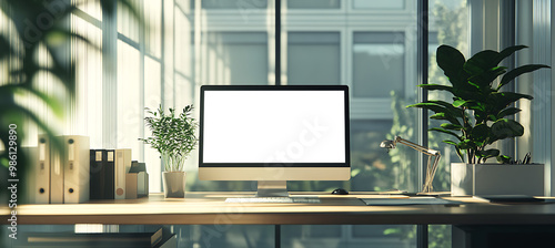 The watermark will not be included on Wall mural.: Contemporary computer screen mockup in a sleek office setting - transparent png banner for web desig