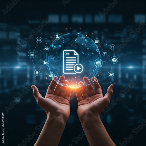 Wall mural content management. hand of man holding a global digital network connection, data-driven content dis - Wall murals Wall mural content management. hand of man holding a global digital network connection, data-driven content dis - Wall murals