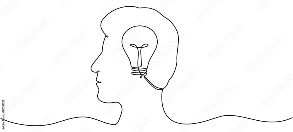 Wall mural continuous line art drawn man head with light bulb. create idea concept. vector illustration isolate - Wall murals Wall mural continuous line art drawn man head with light bulb. create idea concept. vector illustration isolate - Wall murals