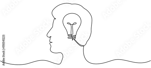 Wall mural continuous line art drawn man head with light bulb. create idea concept. vector illustration isolate