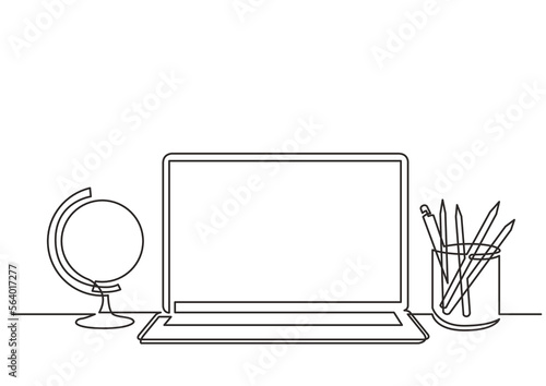 Wall mural continuous line drawing vector illustration with fully editable stroke of globe notepad pencils