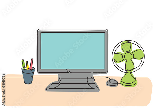 Wall mural continuous line drawing work desk computer cooling fan 3 colored - png image with transparent backgr