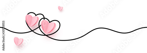 Wall mural : Continuous line heart shape border with realistic paper heart on white background for valentines, wo