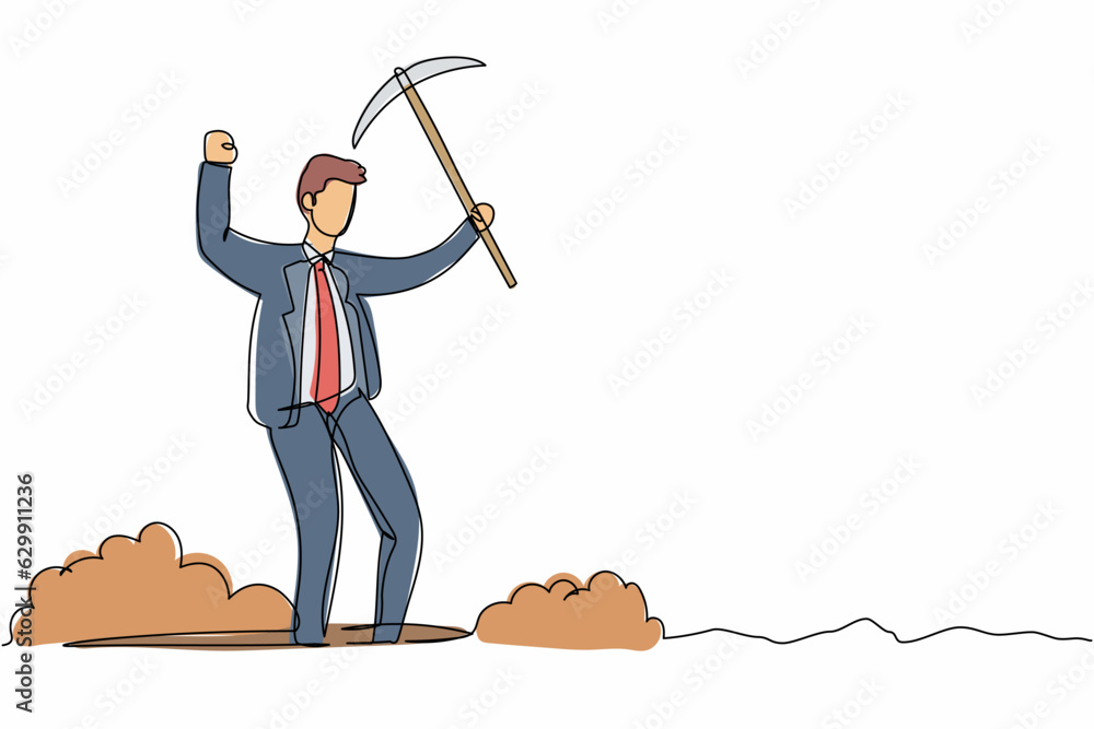 Wall mural continuous one line drawing happy businessman in hole prancing while lifting pickaxe with hands. mal