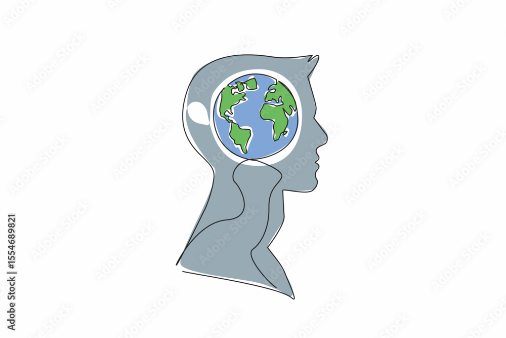 The watermark will not be included on Wall mural.: Continuous one line drawing the head of a young man with a globe in the middle of his head - taking s