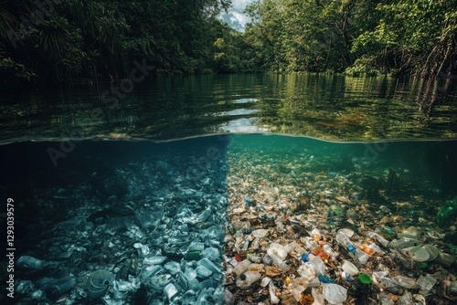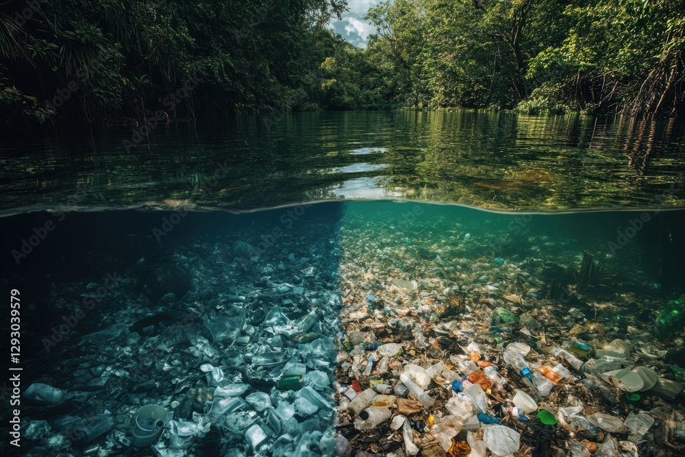 The watermark will not be included on Wall mural.: Contrast between a polluted river and a pristine stream highlights environmental issues and the need
