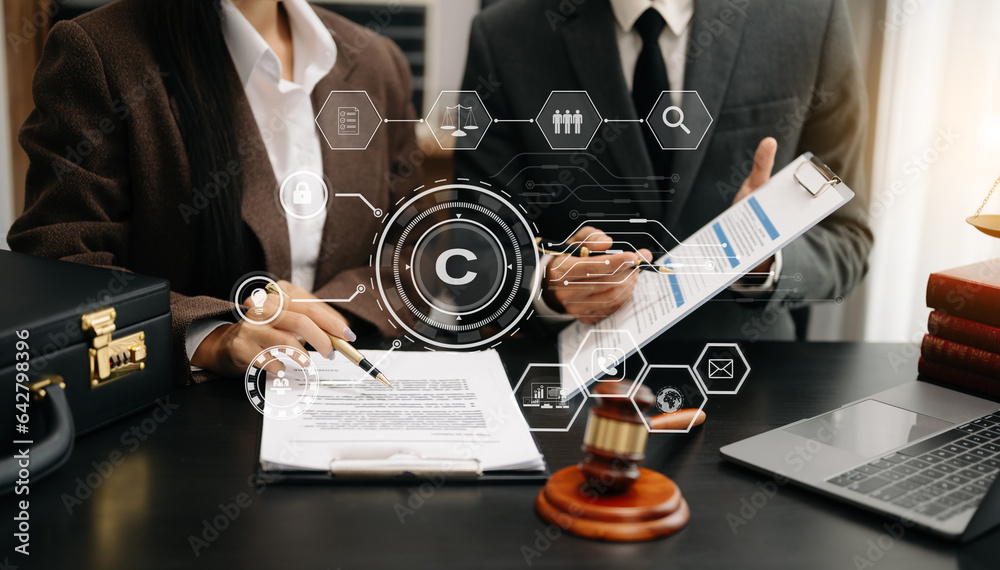The watermark will not be included on Wall mural.: Copyright or patent concept, business team analyzing data and using smart phone and tablet with virt