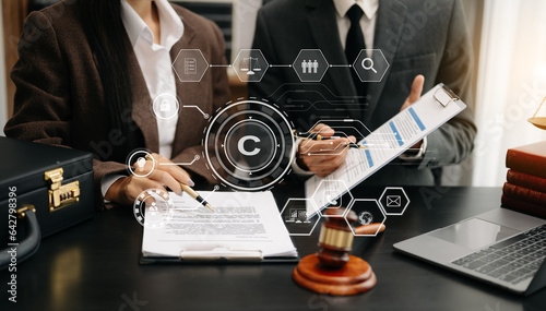 Wall mural : Copyright or patent concept, business team analyzing data and using smart phone and tablet with virt