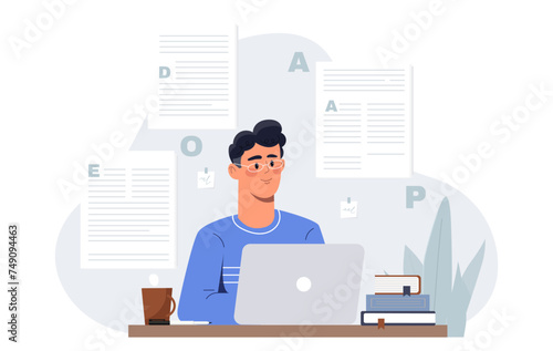 The watermark will not be included on Wall mural.: Copywriter with laptop - man typing articles and creating interesting content for social networks and