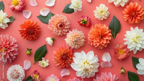 Wall mural : Coral background with various colorful dahlia flowers and green leaves in a top view - flat lay compo