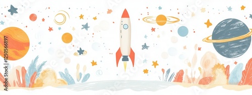 The watermark will not be included on Wall mural.: Cosmic adventure, vibrant flat illustration showcasing a rocket navigating through colorful planets